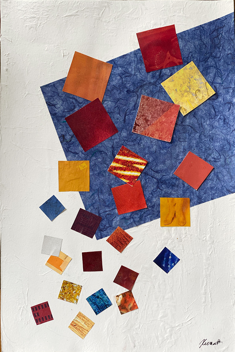 Meanwhile, this month I woke up one morning with a new art project firmly in my mind. I have now completed a series of six “Square Dances” which I am happy to show here all together. I seem to have done three sets of ‘pairs’ based on the color of the background paper I used to cover the substrate before I started with squares, so if you don’t mind, I’ll show them in those pairs: red & blue, black, white and shiny, and pink.