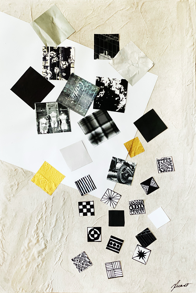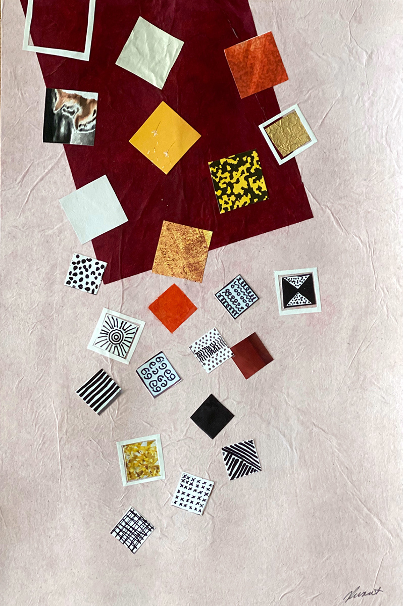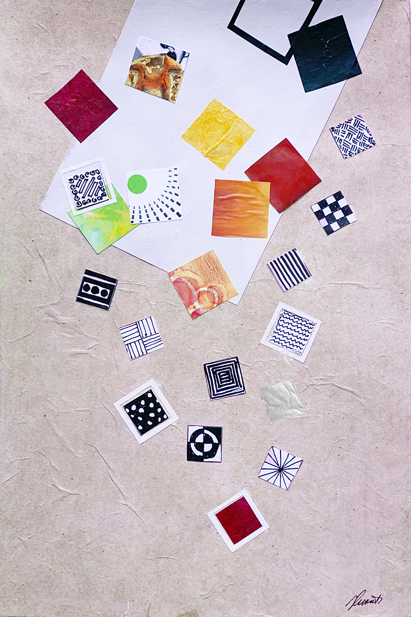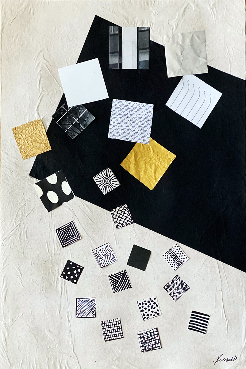 Meanwhile, this month I woke up one morning with a new art project firmly in my mind. I have now completed a series of six “Square Dances” which I am happy to show here all together. I seem to have done three sets of ‘pairs’ based on the color of the background paper I used to cover the substrate before I started with squares, so if you don’t mind, I’ll show them in those pairs: red & blue, black, white and shiny, and pink.