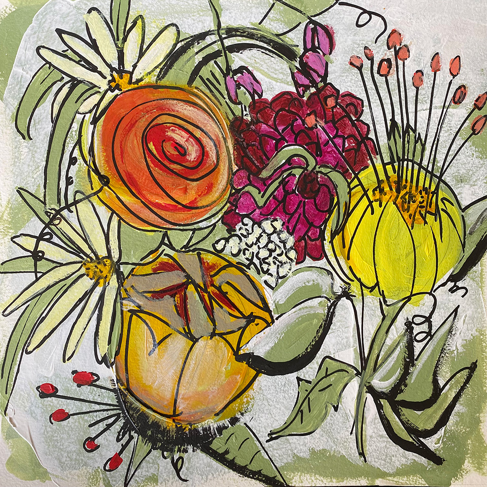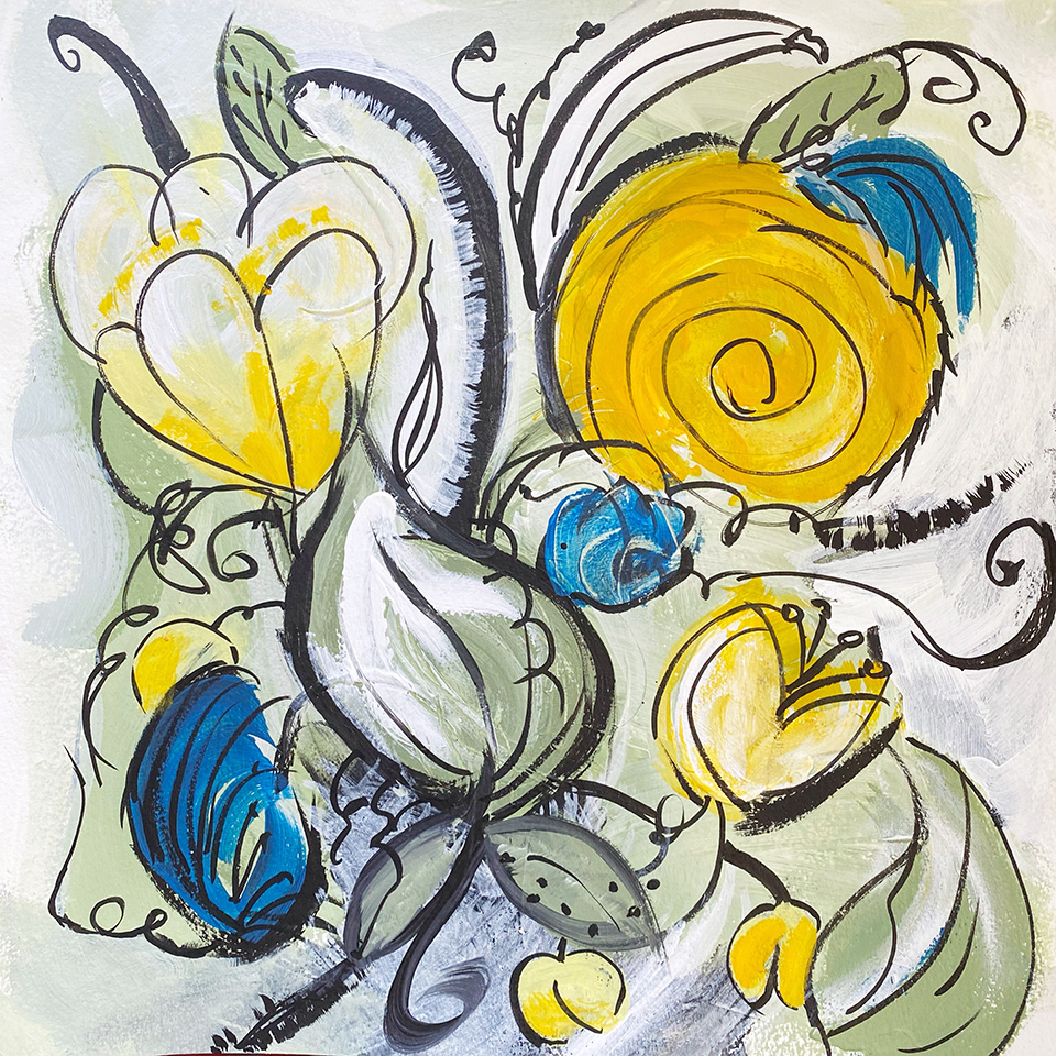 During and after those, I went on little creative sidetrips! In experimenting with a style of light painting and black outlines I discovered I was creating florals – and then some trees! So I kept going and made 7 of florals and two ‘blues trees’ squares which, though completely imaginary, made be think of driving through the French countryside. They were really fun and I’ll probably do more: